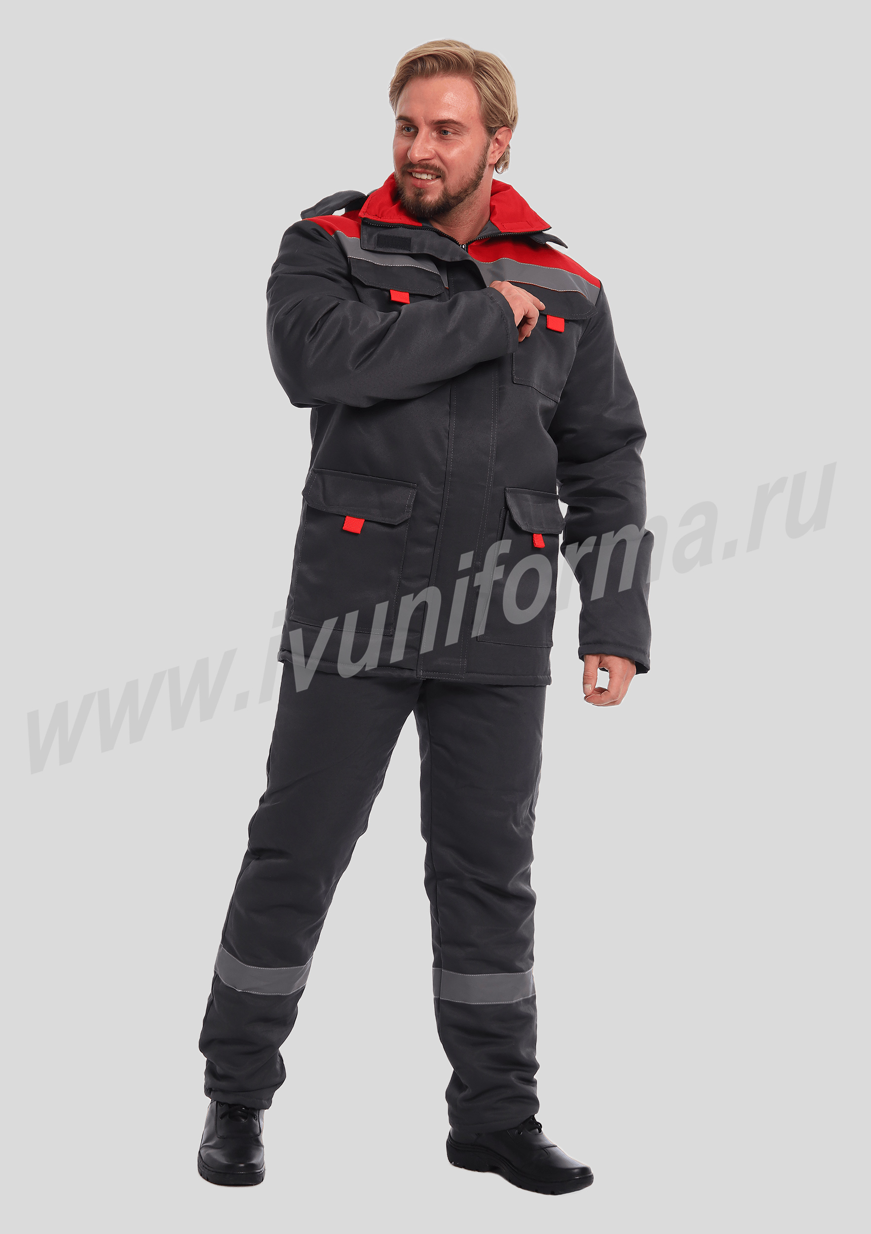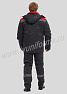 Костюм рабочий утепленный мужской состоит из куртки и полукомбинезона. Куртка удлиненная с воротником стойкой, прямого силуэта с застежкой на тракторную молнию с ветрозащитным клапаном на липучках "Velcro". На куртке два нагрудных и два нижних накладных кармана с клапанами и застежками на липучку "Velcro". Капюшон съёмный, на молнии ,с возможностью регулировки объема по лицевой части. Полукомбинезон прямого силуэта, с застежкой на две пуговицы и молнию. На брюках два передних кармана с косой линией входа. Однослойное утепление брюк объемом 200 гр/кв.м.
