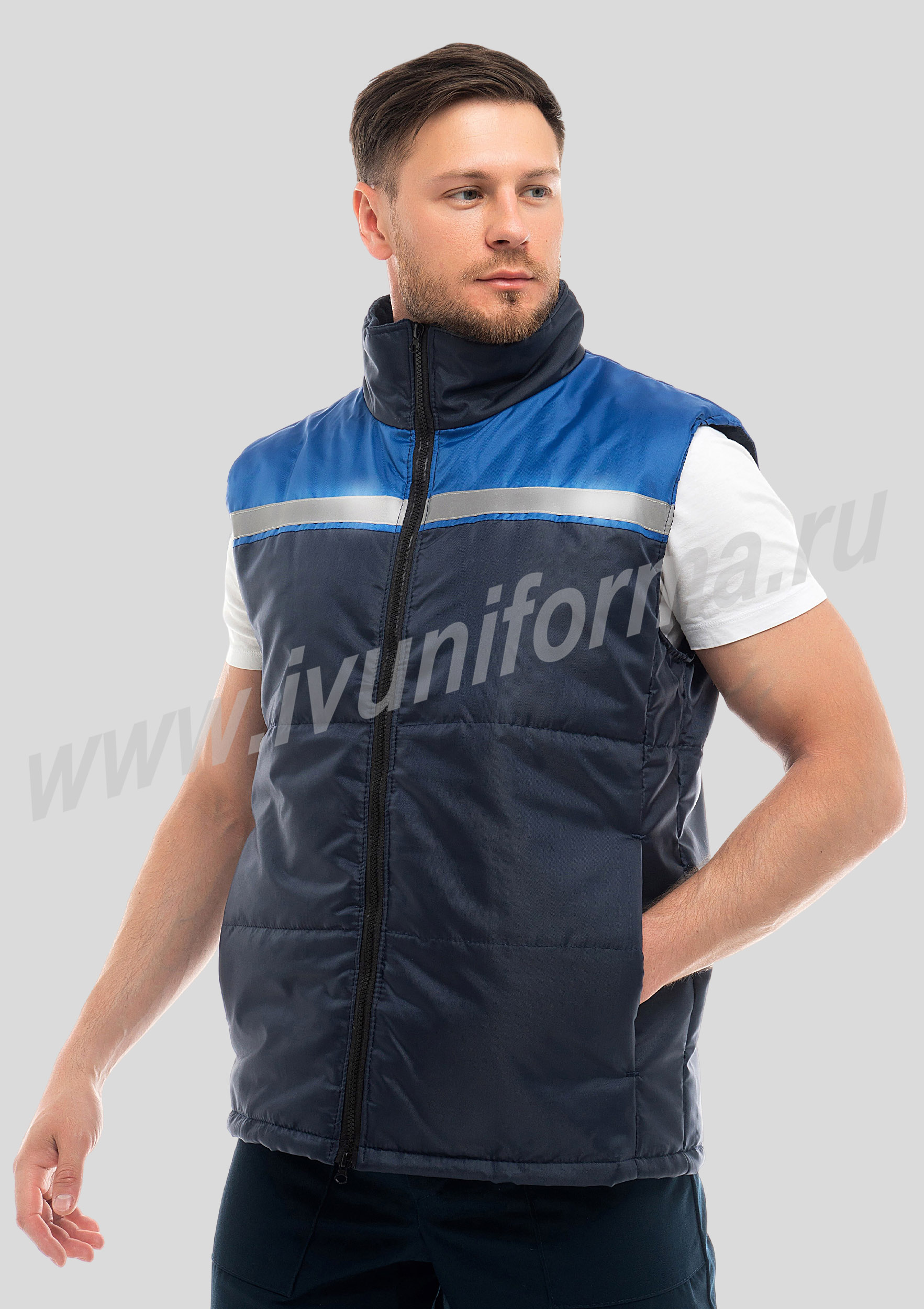 Жилет утепленный на молнии с двумя боковыми карманами в нижней части. Жилет рабочий застегивается на центральную застежку тракторной молнией с двумя замками. Внутренняя часть жилета утеплена синтепоном, а задняя часть воротника выполнена из флиса. Жилет является универсальным для использования как мужчинам, так и женщинам.
